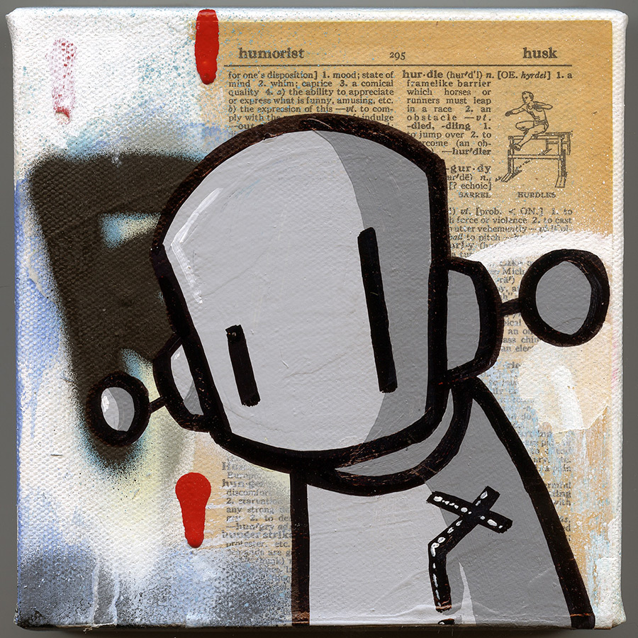 A child of the 80s, Chris’ world was often completely flooded with the imagery and ideas presented by his television, his comic books, and the music and movies of the time. Immersed in these various mediums, Chris began to store the images brought forward though these everyday experiences in what he refers to as a “mental journal”. This journal was a haven of his thoughts that he could refer back to whenever necessary. Chris’ paintings frequently cite past conceptions of popular culture embedded in his psyche’s cache. This use of intertextuality also serves to offer a comfort or familiarity of sorts to the viewer. Chris’ works frequently reveal everyday musings and people one would pass on the street without looking or thinking about twice. These images also aid Chris in the creation of a visual language comprised of his own iconographic imagery. Through the repetition of this imagery, Chris strives to familiarize his viewers with the language he has constructed. Chris believes that the notions within his pieces serve as a backbone to the many stories created by the onlooker when he or she is viewing the work. In 2001 Chris set in motion RobotsWillKill.com. Robots Will Kill is an arts site dedicated to community and exposure for artists/media often disregarded by the mainstream art world. Rather than featuring his own work exclusively, he opened it up to allow the possibility for it to become whatever it evolved into being. RWK has a core group of artists, those artists are Chris, Kev/Psyn, Veng and Over Under. Along with overseas affiliates ECB (Germany), Peeta (Italy), Flying Fortress (Germany) and JesseRobot (Belgium). This extended roster of artists helps to promote RWK as we push the boundaries of art.