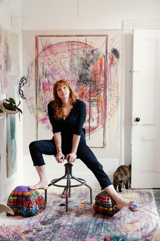 Courtney Childress works with personal yet ordinary materials, bringing objects out of the periphery into focus. She lives and works in New York, NY. She received her MFA from S.U.N.Y. at Purchase College, Purchase, NY (2012) and her BFA from the University of Alabama, Tuscaloosa, AL (2008).  My mom and aunt went on a road trip with my grandmother from TX to CO in the summer of 1960. They left crayons in the backseat when they stopped for lunch. These melted into puddles in the back of the rental convertible. My mom laughs when she tells the part about throwing chunks of crayon out the window as they drove down the highway. I amassed a great collection of crayons, that I peeled and melted down, layering colors into painted-desert inspired rock crayons. In this case, I used close to 4,000 crayons and it is so large that I have to push it across the floor to ‘draw.’