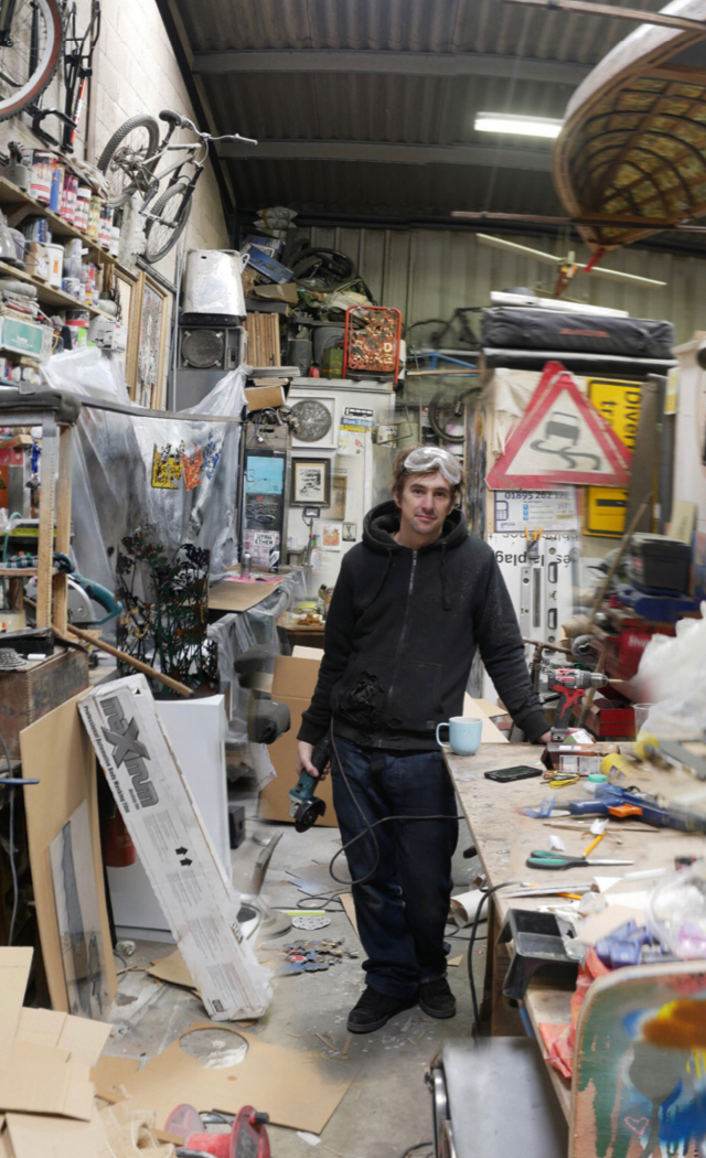 Dan Rawlings is a contemporary British artist born in Watford in 1979, he grew up in Essex and currently lives and works in Gloucestershire. A sympathy for unloved and forgotten relics and a fascination with nature’s resilience have inspired him to create visions of a world where man’s impact is being slowly reclaimed by nature. Dan considers no technique or substrate out of bounds in achieving his intended results but is probably best known for his manipulation of metal and light, conceived with intricate hand-plasma cutting. Recently he has been introducing sign painting and motion to his works. Notable projects include the sculpture ‘nature delivers’ based on the wreckage of a Ford Transit van and the huge ‘mighty oak’, based on a 16 ft farm yard silo constructed for the affordable art fair’s 15th birthday in Battersea park. His signature works cut from vintage hand saws can be found in collections around the world.