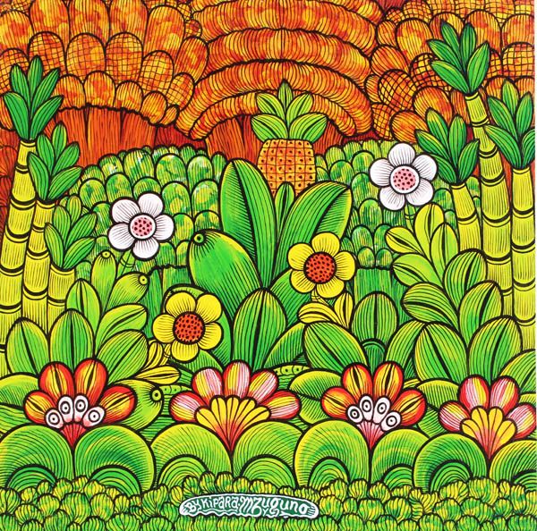 David Mzuguno started painting in 1967 and became known in 1969 at age eighteen, by wining the third prize in the Esso Calendar Competition. Originally from the Kilimandjaro region, Pare district, and of Mpare Tribe, he was born in 1951 in the village of Gonja Bombo (at the junction with Mkomasi on the old Moshi road), where he also attended primary school at the Luteran Mission. David Mzuguno at his studio in 2000In 1967 Mzuguno arrives in Dar-es-Salaam and, two years later goes to live with his uncle in Msasani, nearby the Morogoro Stores. While attending secondary school (with art subjects) and passing by the Tingatinga painters, he used to make fun of them because of their non-realistic style. David Mzuguno completed Form 4 in 1972, and started working as a mining prospector from 1973 to 1979, but continued to paint and brought his paintings to sell at hotels. In 1979 Mzuguno decides to drop his realistic style and join the Tingatinga Partnership opting for the tingatinga style (which was much more successful at the time). Mruta accepted him as member no. 42 at the Partnership. David Mzuguno stayed at the Tingatinga Centre until 1989. He was selling more than the other painters partly because, due to his education, he could speak english with the customers. When he left, he spent the next couple of years painting for a japanese lady who was a guest at the Dar-es-Salaam University. Since then, Mzuguno has pursued his career, painting at his home in Kahaba, 15 Km from the city center. In December 2003 he held a solo-exhibition at the Alliance Francaise in Dar. Mzuguno passed away June, 2010. He was one of the painters with the highest level of education. His works demonstrated a great originality in meticulously depicting beautiful scenes of rural life, with a lush of intrincate vegetation.