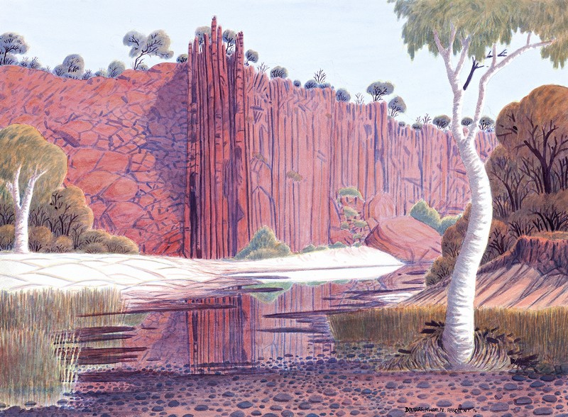 Douglas Kwarlpe Abbott was raised in Alice Springs by his parents Gordon and Joyleen Abbott. As a young boy, Douglas used to watch Albert Namatjira, Clem Abbott and the original Hermannsburg watercolor artists paint. Clem advised Douglas to find his own style and try to develop it, which he has done with great success. Douglas has been painting for many years, his paintings are found in many businesses in Alice Springs including the Central Australian Aboriginal Alcohol Programs Unit (CAAAPU) building which he helped to set up.