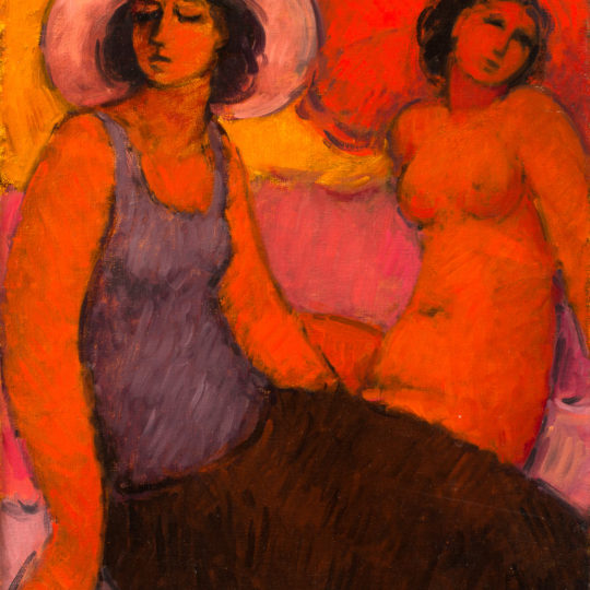 Esmonde-White was born 1914 in Dundee, Kwa-Zulu Natal, South Africa. Not much is known about her upbringing, but she did experience formal training in the arts, starting from 1932, when she enrolled at the University of Natal. Here she was taught under O J Oxley until 1934. In 1935-36 Esmonde-White attended the Royal College of Art, in London, during her studies in London; she was awarded Herbert Baker Scholarship to study mural painting in London and Italy. Finally in 1937 she studied at the British School in Rome. Between 1938 and 1954 Esmonde-White was a member of the New Group. In 1951 she established and taught in the department of design at Michaelis School of Fine Art, in Cape Town, till 1960. During her career as an artist, she was involved in illustration of various children’s books. In 1959 she designed stage sets and costumes for ballet and opera performed at the University of Cape Town. In 1963 she was involved in stage and costume designs for CAPAB dramas. This is an aspect which influenced her work, instilling a sense of the theatrical in her use of often dramatically stylised compositions and use of warm, strong colour. Esmonde-White’s works are primarily figure compositions, often focusing on the subject of women and their actions. Esmonde-White’s painting changed over the years, her earlier works more linear in concept with less sensuous forms. Gradually, through her practice, the strong outline faded, and more emphasis was put on the painterly quality in large coloured areas. Her works are primarily in oil, with large amounts of graphic works including African inspired woodcuts. The dramatic colour use and expressive brush work is characteristic of Esmonde-White’s painting.