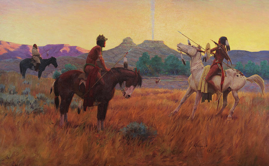 An American painter born in 1878 in Pierce City, Idaho, Elling William Gollings drew on his own life to create paintings that accurately depicted life in the Old West. As a boy, he spent time in New York, Michigan, and Illinois in addition to his Idaho birthplace. At 19, Gollings traveled through small mining and ranching communities in South Dakota, Nebraska, and Montana, where he worked as a shepherd and cowboy. Although he supported himself through ranching, Gollings had an interest in art from an early age. After starting to create with a set of mail-order paints, he was admitted to the Chicago Academy of Art. On moving to Wyoming, he continued to pursue his artistic interests, eventually becoming proficient in etching. In 1909, Gollings built a studio in Sheridan, Wyoming, and devoted himself to painting Western scenes, aided by a lifetime of personal involvement in his subject matter. Gollings’ works are displayed in American institutions such as Oklahoma’s Gilcrease Museum, the Buffalo Bill Historical Center in Cody, Wyoming, and the National Museum of Wildlife Art, in Jackson Hole, Wyoming.