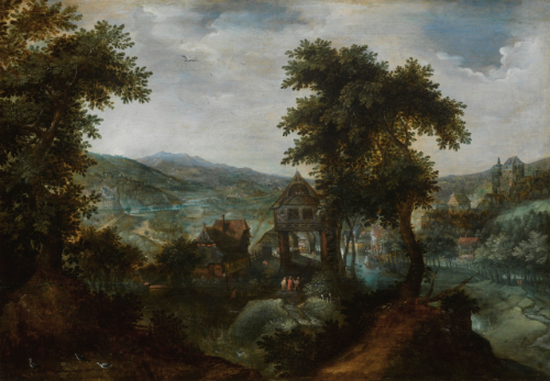 Born into a family of painters, Gillis van Coninxloo first apprenticed in Antwerp with Pieter Coecke van Aelst. After a sojourn in France, he joined Antwerp's Guild of Saint Luke by 1570. With religious strife in the Spanish-occupied Netherlands, the Calvinist Coninxloo fled north to escape persecution in 1585 and moved to Germany in 1587. His experience drawing tapestry cartoons there may have influenced his departure from the tradition of panoramic landscape. He began introducing groups of foreground trees that obstructed vistas, sharp contrasts of light and dark, and stylized foliage. In 1595 Coninxloo moved to Amsterdam, where his landscape style coalesced into seemingly direct glimpses of nature. His up-close, heroic landscapes were based on reality but also incorporated idealization and decorative aspects, creating a feeling of unity between humans and nature and between landscape and viewer. Coninxloo may have known of similar artistic explorations in Italy through prints. His dense, airless forest scenes influenced Jan Brueghel the Elder and inspired the Dutch realist painters of the 1600s. "[Coninxloo] is, as far as I know, the best landscape painter of his time; his style is now frequently imitated in Holland," wrote artist Karel Van Mander in 1604.
