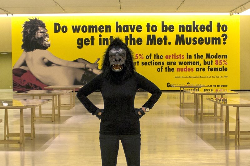 The Guerrilla Girls are feminist activist artists. Over 55 people have been members over the years, some for weeks, some for decades. Our anonymity keeps the focus on the issues, and away from who we might be. We wear gorilla masks in public and use facts, humor and outrageous visuals to expose gender and ethnic bias as well as corruption in politics, art, film, and pop culture. We undermine the idea of a mainstream narrative by revealing the understory, the subtext, the overlooked, and the downright unfair. We believe in an intersectional feminism that fights discrimination and supports human rights for all people and all genders. We have done over 100 street projects, posters and stickers all over the world, including New York, Los Angeles, Minneapolis, Mexico City, Istanbul, London, Bilbao, Rotterdam, and Shanghai, to name just a few. We also do projects and exhibitions at museums, attacking them for their bad behavior and discriminatory practices right on their own walls, including our 2015 stealth projection about income inequality and the super rich hijacking art on the façade of the Whitney Museum in New York. Our retrospectives in Bilbao and Madrid, Guerrilla Girls 1985-2015, and our US traveling exhibition, Guerrilla Girls: Not Ready To Make Nice, have attracted thousands. We could be anyone. We are everywhere. What’s next? More creative complaining!! New projects in London, Paris, Cologne, and more!