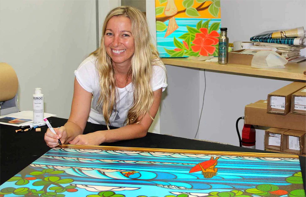 When you look at Heather Brown’s art, you might notice that peaceful tranquility falls over you. Whether you’re reminded of the beauty of Hawaii depicted in each picture or the rush that accompanies surfing a wave, there’s no question that Heather’s art inspires us to be at peace and live Aloha. Growing up in Southern California, Heather was raised by a family of artists and it’s no surprise that her talents were inherited at a young age. During her earlier years, Heather wanted to be a veterinarian or work with animals. However, since moving to Hawaii nearly 20 years ago, Heather has made it her purpose to bring attention to the beauty of the oceans surrounding these beautiful islands. She has done what most artists struggle to do: make it as a full-time artist. Heather’s goal is to create artwork that inspires people while protecting the oceans and the environment against pollution for all to enjoy for years to come. She hopes her artwork inspires you to find the beauty in your surroundings while connecting to nature and the Earth.