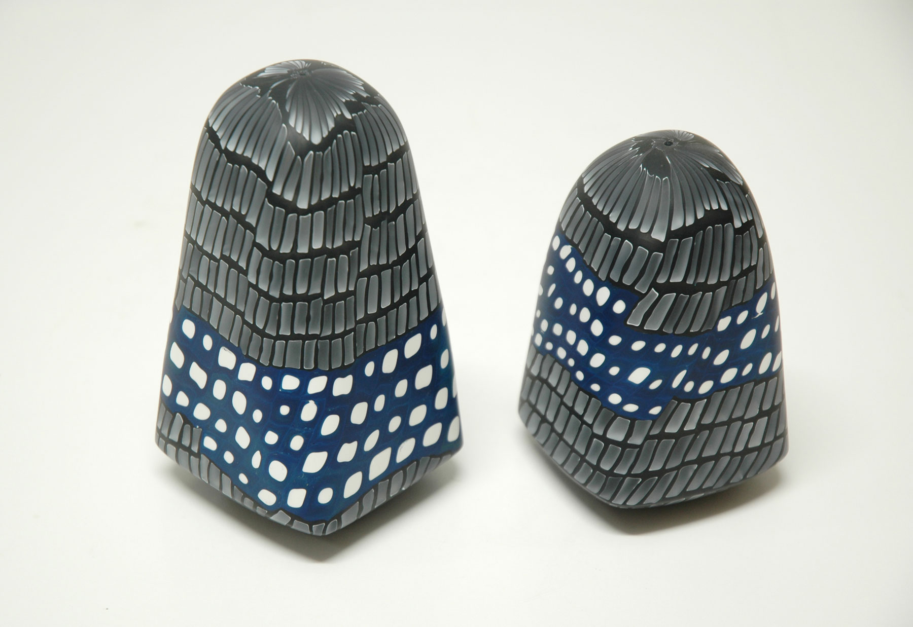 Hilary Crawford’s glass forms have a streamlined, machine-like aesthetic which is a ​derivative of modern architecture. The use of murrine implants in the forms represents random impressions of urban culture, a visual hybrid of streams of information and the built environment. In Hilary’s own words, “Fragments of information are sequenced so we perceive them on the move; other information we have to look at again, to blink, so as to recognize what we absorb.” Hilary earned a Bachelor of Design (Ceramics and Glass) from the University of South Australia in Adelaide and, prior to that, a Glass Major from the Alberta College of Art, Calgary, Canada. In 2001, she graduated with first class Honours from the ANU School of the Art Glass Workshop in Canberra. Hilary has exhibited in Australia, New Zealand, Canada, USA and in Europe. She was a recipient of the Pole Turners Scholarship to the renowned Pilchuck Glass School in Washington State, USA. Her work has been acquired by Canberra Museum and Gallery, University of Canberra Art Collection, Art Gallery of South Australia and talm Springs Art Museum (California, USA).