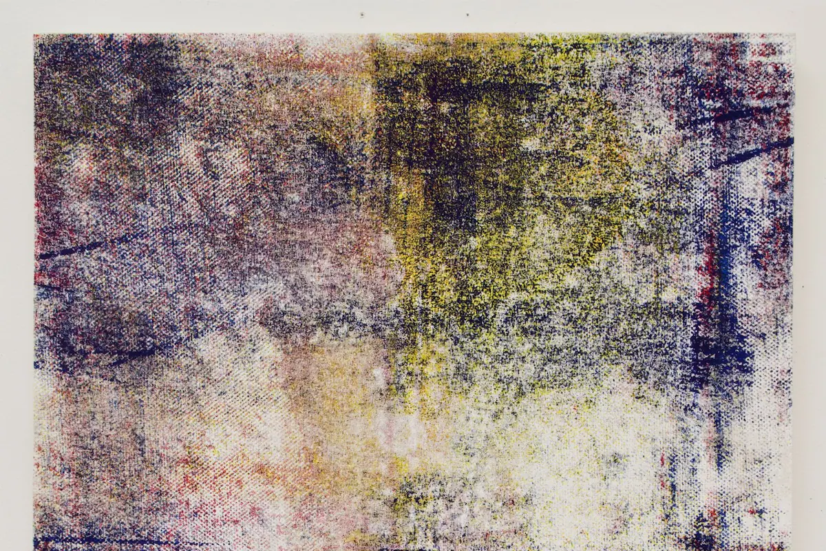 Israel Lund is a painter who works recursively. He uses the tools of silkscreen to make images that are defined by the circumstances of their creation—the particular unrepeatable conditions of squeegee pressure, angle, canvas texture, ink viscosity. Its a process of distortion, a kind of hands-on, analog algorithm. Completed canvasses are photographed and fed back into the system to be further degraded and randomized. Photographs of the work of other artists (Daniel Buren’s stripes and Martin Kippenberger’s scribbles) also become raw inputs, distorted and mixed with all the other information bouncing around this feedback loop.