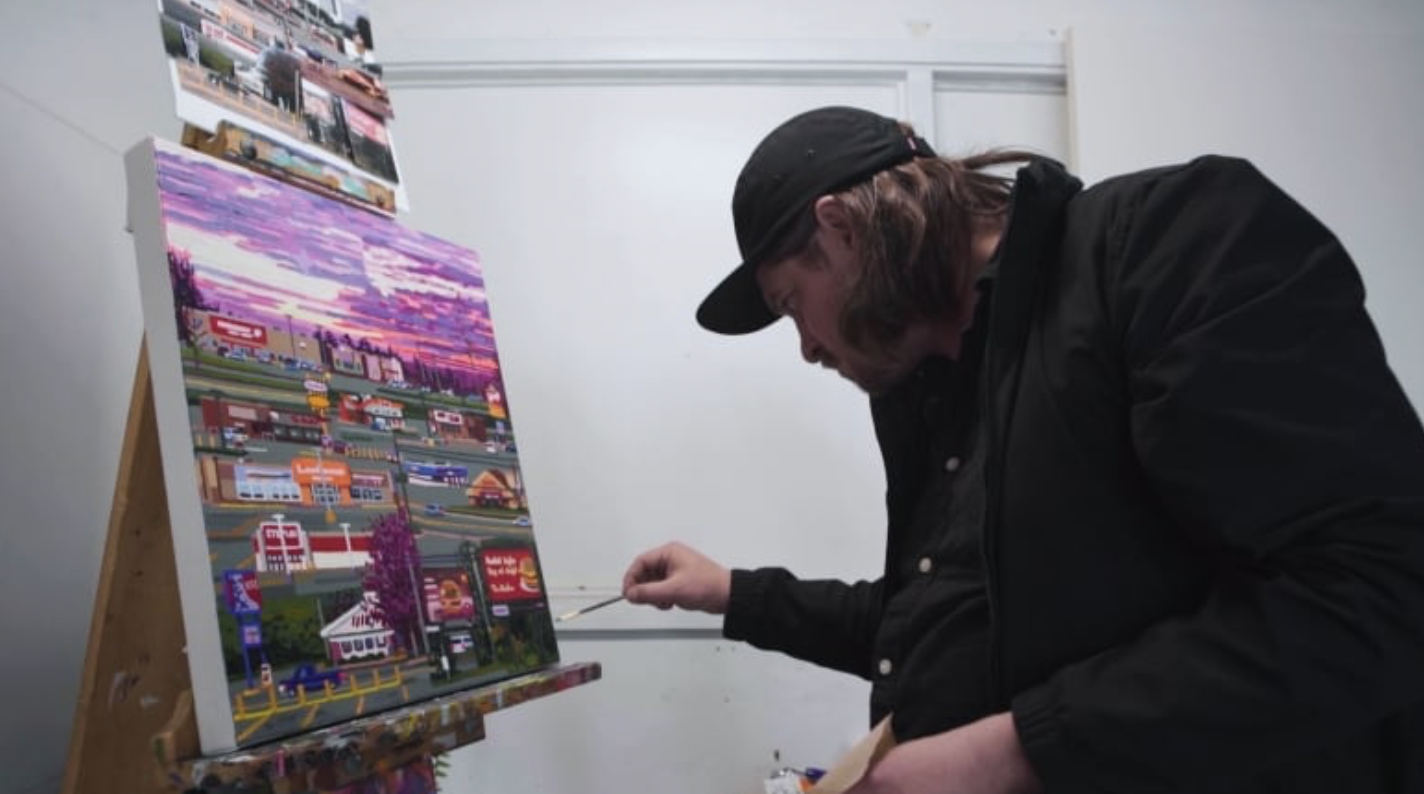 Jack Bishop is originally from Quispamsis, NB and received a BFA from NSCAD in 2007. He now lives and works in Halifax. Jack has received creation grants from Arts NB, Arts NS, and the Canada Council for the Arts, and was recently included in “The Painting Project”, a major survey exhibition of contemporary painting in Canada at Galerie L’UQAM in Montreal. His work is in numerous public and private collections across Canada. ​ 'My paintings are dense representations of car​-culture, consumerism, and urban sprawl. They revisit Canadian landscape tradition in terms not of natural but rather of commercial space, where ubiquitous retail outlets dictate use of the land and proclaim its occupation. In this work, I aim to subvert romanticized ideas of untouched Canadian wilderness, iconized historically in works such as the Group of Seven.'