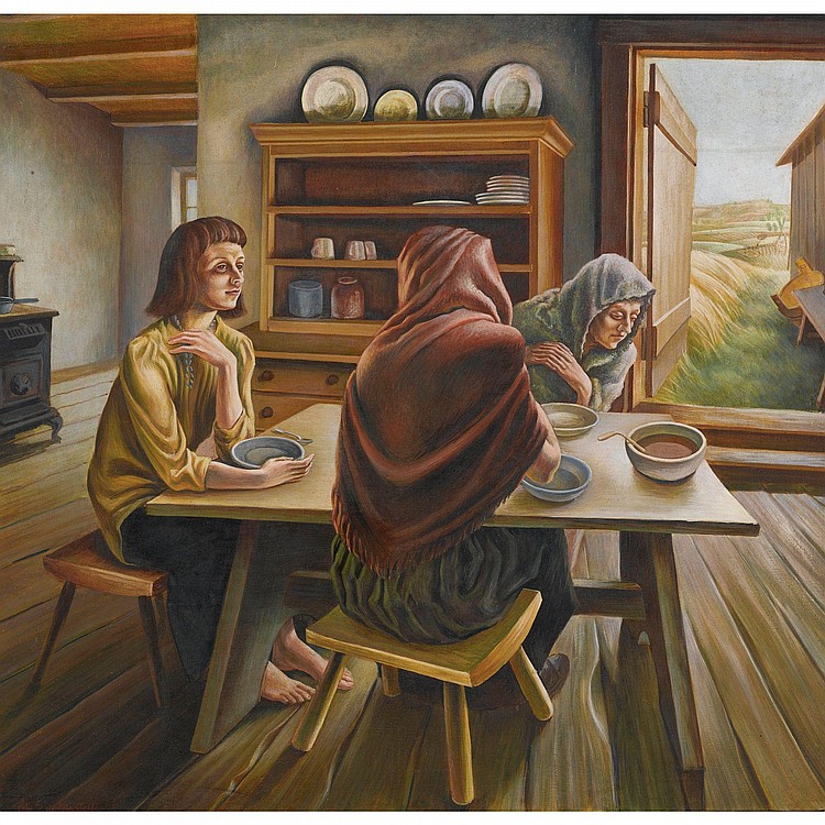 John Stockton de Martelly was a lithographer, etcher, painter, illustrator, teacher and writer. He was born in Philadelphia and studied at the Pennsylvania Academy of Fine Arts; and in Florence, Italy, and at the Royal College of Art in London. In the 1930s and 1940s, he taught printmaking at the Kansas City Art Institute to the same students who studied painting with Thomas Hart Benton. De Martelly became a close friend of Benton, and was influenced by his Regionalist style. When Benton was no longer at the Art Institute, the Board of Governors offered de Martelly Benton’s job as head of the Painting Department, to which he declined. De Martelly’s lithographs, sold through the Associated American Artists Galleries in New York in the 1930s and 1940s, captured the essence of the rural American landscape. Eventually, de Martelly took a position as the artist-in-residence at Michigan State Univeristy in East Lansing. By the late 1940s he abandoned Regionalism for Abstract Expressionism, and closely studied Honore Daumier. His drawings, paintings, and prints are now in the collections of many museums, including the Victoria and Albert Museum in London, the Corcoran Gallery of Art in Washington, D.C., Kresge Art Museum in East Lansing, the Metropolitan Museum of Art, the Nelson-Atkins Museum of Art in Kansas City, the Detroit Institute of Art, and the Whitney Museum of American Art.