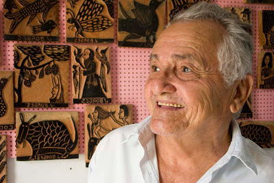 Artist and poet José Francisco Borges was born in 1935 in the village of Bezerros, Pernambuco state, in Northeastern Brazil. Today Borges is Brazil's best-known folk artist working in the wood-cut medium, and his work has been exhibited all over the world. But he comes out of a long tradition of folk poet/artists who publish their own work in the form of small (generally about 6" by 9") cheap chap-books or pamphlets written in verse, known as folhetos. They are also known as literatura de cordel after the way vendors sell them in the marketplace, hanging over a string. This tradition (including the work of Borges) is described in detail by Candace Slater in her book Stories on a String.