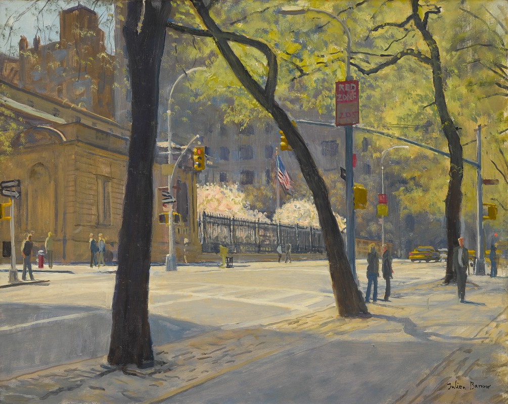 ulian Barrow was born in Cumberland but lived for most of his life in London. He studied in Florence with Pietro Annigoni (famous for his early portrait of Queen Elizabeth II) and was an inveterate traveler, painting views throughout the world, including in London, New York, the Middle East, India, and the Far East. For decades he lived, with his wife Serena, in a magnificent studio on Tite Street in Chelsea in the building formerly occupied at various times by Sargent, Whistler, Glyn Philpot and Augustus John. Barrow was a frequent exhibitor at the Royal Academy and was a longtime President of the Chelsea Art Society. Julian Barrow was described by James Lees-Milne as "a country house painter par excellence" and his commissions for interiors and exteriors of country estates took him all over England, Scotland, Ireland, and America. He also painted many of the private clubs in London and New York. In 1977, for the Queen's Silver Jubilee, Barrow produced a painting of the House of Lords which now hangs at Westminster. John Julius Norwich, in his introduction to the catalogue of a one-man show at the Fine Art Society in London in 2005, notes that Barrow's pictures "radiate a love of life, a joy in light and shade and colour, a grateful appreciation of all the blessedness that lies around us if we can only make the effort to see it. They warm us; they cheer us; they convince us that whatever terrible things happen in the world, there is a beauty there a-plenty for the asking - and for the taking."