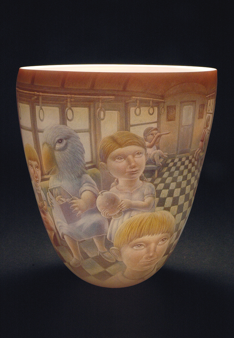 Kazumi Ikemoto uses imaginary half-man, half-beast creatures in scenes vaguely reminiscent of something “you have seen before” (artist’s words). The upturned, innocent eyes of the characters, not unlike those found in contemporary styles of animation and comics often associated with Japanese contemporary art, rivet the viewers. Floating above architectural realms that reflect the years he spent in Italy, his 360-degree scenes are depicted around the curved surface of large glass vessels. Ikemoto depicts a hazy world of chaotic memories where reality and fantasy intersect, half where the past and the present co-exist. His images appear to be painted on the glass but are instead created by an elaborate process that produces a rich depth of hues: using a simple nozzle he blows vitreous enamel pigments onto the glass surface, then removes excess pigments with a brush and fires the layer at a temperature of 560 degree C. He repeats the process layer by layer of color. In addition to his career as an independent artist, Ikemoto is a professor at the Tama Art Institute, where the first glass art program in Japan was established. His work is exhibited in galleries and museums throughout Asia, Europe, ​and the USA.