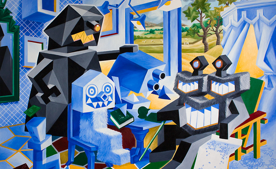 Kriki is an artist born in 1965 in Paris; he lives and works in Paris. In 1984, in Paris, Kriki founds a group of painters called Nuklé-Art and the electro punk group Les Envahisseurs. With the street and the Underground as his art school, he is involved in the beginnings of what is now known as Street Art. Immersed in alternative culture, he is identified from the beginning as one of the emblematic figures amongst the young French painters of the nineteen eighties. Kriki clearly belongs to the generation whose sensibility expressed itself in Free Figurative Art, which he helps to renew. Still very young, he exhibits with Keith Haring, Futura 2000 and even with Basquiat and Wim Delvoye. At just 23 years old, he has his first solo exhibition at FIAC (Paris) which will then move on to the Gramercy Art Fair in New York; this will lead to taking part in the very first exhibitions of his work in now famous Paris galleries such as Jérôme de Noirmont and Kamel Mennour. Kriki at that time becomes well known for a style which becomes immediately identifiable on the international scene, making him into one of the major artists of his generation. In 1985, Kriki invents Fuzz, a half-robot, half polymorphous fetish, appearing as a virus infecting the history of art, and of which the Museum of Modern Art in Paris will publish a specimen. Kriki manipulates the original images from which his paintings emerge, resisting our initial attempts at a reading in order to express themselves in a universal language. Today, Kriki is still an incarnation of punk culture in French contemporary art, leading Ernest Van Buyender, the Director of the Museum of Contemporary Art in Antwerp to write: “Kriki is the only French artist whose originality and ambition can be seen as a bridge between Sub Culture and High Culture”.