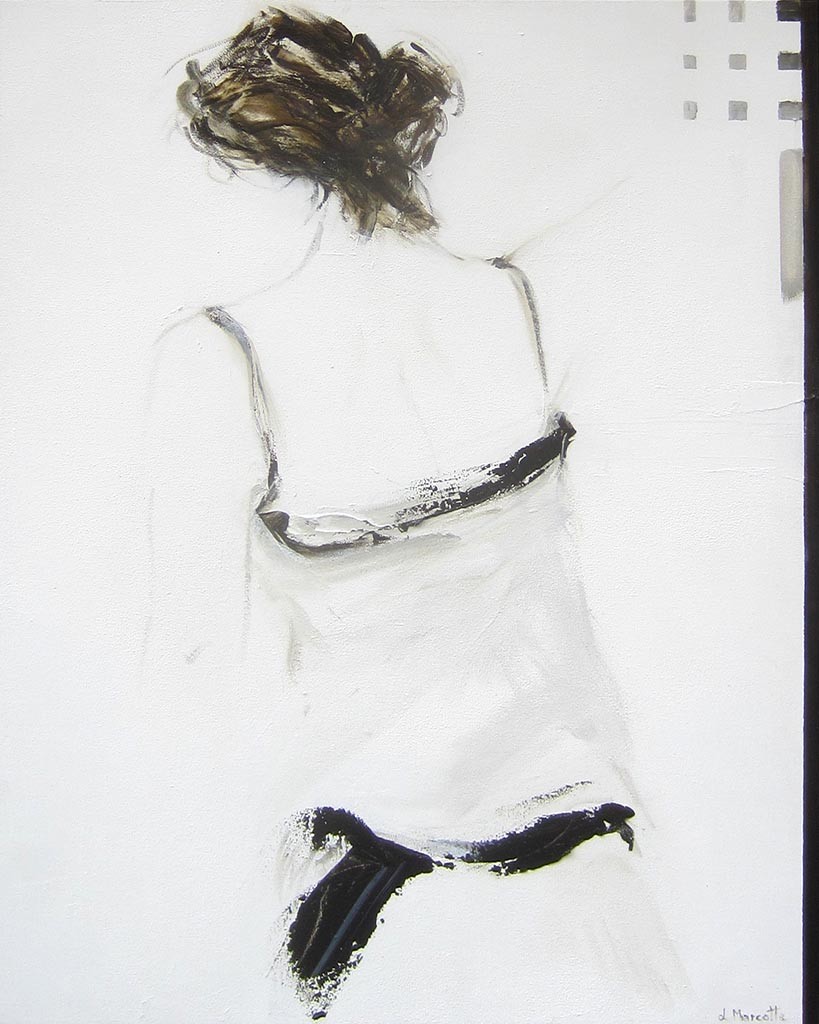 Lucille Marcotte was born in 1951 in Magog. In 2000, Lucille Marcotte began her Bachelor's degree in Visual Arts at Laval University. She had previously completed a Bachelor's and Master's degree at the University of Quebec in Psychology, as well as a degree in Education and Cultural Research. Several years later, she decided to leave her career in Psychology to follow her dream and work as a painter. In her art pieces, the body appears to be a privileged object. The female figure is shown alone in a universe free from societies preconceptions. The woman' s force and fragility come together as one in the painting, but leave the viewer longing to understand her thoughts. The exposition “L’ Invitation au Voyage”“le Violon Bleu” was supported by the “Délégation du Québec” in London. During this event, the artist was rewarded for the remarkable quality of her work.