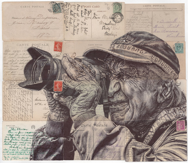 With the humble Bic Biro as his tool of choice, London-based Powell creates intricate portraits on antique documents. His favoured subjects are elderly, a natural fit for the paper he uses and his detailed style: post marks and typography merge with pen strokes to create a captivating whole. In contrast, Powell's paintings (on cardboard and other found materials) exhibit street art and advertising influences while maintaining extraordinary detail.