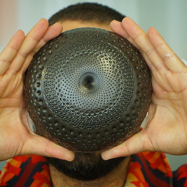 Mario Martinez (aka MARS-1) paints from a penetrating perspective of great depth. Viewers are drawn into his imaginative compositions, overflowing with colorful geometric and organic shapes, layered to form unique patterns and textures. The artist signature style of vast, abstracted, quasi-extraterrestrial looking landscapes feature imagery of surreal distortions, contained within spherically convex transparent bubbles. Skillfully combining optical color blending with perspective line work, his painting techniques result in very three-dimensional forms, which echo the anatomy of architecture, and microcosmic structures of biology. These 3-D qualities transcend into his sculptural work, as well. Mars-1’s distinctly individual aesthetic is not easily compared to the vision of his contemporaries or artists from past movements. His constantly evolving process continues to expand with each new series of work, seemingly beyond the reaches of even his own awareness. Themes explored range from very scientific to more esoteric phenomena. From theoretical physics, metamorphosis and collective consciousness, to ufology and examining possibilities of otherworldly principles, the relative link between physical and life sciences are applied throughout. Transitional energies, natural multiplicity, helixes and spontaneous biological occurrences all come together, forming imagery with hypotheses beyond the scope of modern technology.