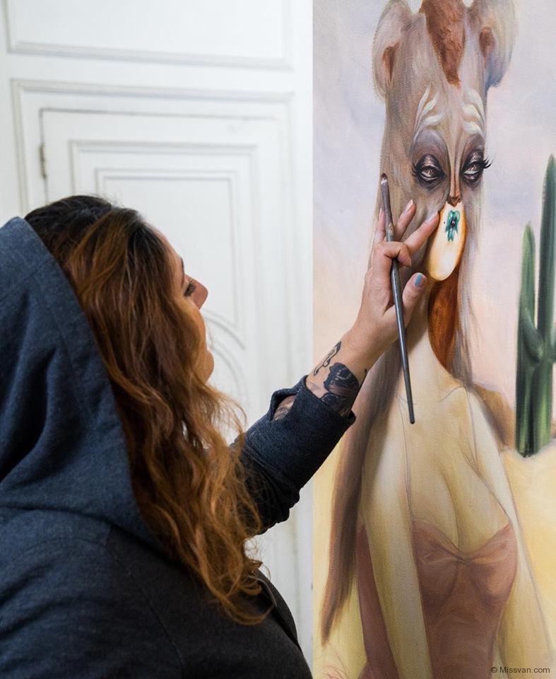 Miss Van, also known as Vanessa Alice Bensimon was born in 1973 in Toulouse, France. She started wall-painting at the age of 20, in 1993, in the streets of her hometown. She is now considered one of the best known painters of the graffiti scene, initiating the feminine street art movement. She traveled the world to exhibit her artwork though she spent most of her artistic life in Barcelona. Her creations display highly recognizable sultry women that she calls 'poupées' (dolls) These painted ladies are represented in a sensual and burlesque manner as they wear under-bust corsets, petticoats, tutus and sometimes disconcerting animal masks. Their kinky attitude also seems to be directly taken from a Moulin Rouge setting, exhibiting bare breasts, long lashes, red and fleshy lips. So these women are painted in a certain way which emphasizes their femininity and their sexual power. Miss Van uses the hair as a precious tool which sensually hides but also reveals femininity. It makes the woman body sublime as the curves of the hair and the body match in harmony. By picturing semi-nudity and curvy ladies with no top model proportions, Miss Van claims that all women are naturally desirable, strong and proud even in their birthday suit. Miss Van clearly stands for women's power and beauty. And although there are few female names in the graffiti scene, she also defends her own condition as a woman artist in a male-dominated area. Her collection of dolls is getting known throughout the world thanks to her street artworks but also exhibitions in the biggest cities of the world. We haven't heard the last of her and her poupées!