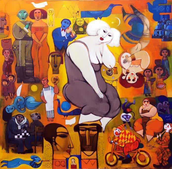 Born in 1952, Mostafa Rahma is an Egyptian painter living and working in Cairo. He was very much influenced by the iconic singer, Om Kalthoum, not just as an artist but mainly as a powerful woman. In his 'Hawanem' series, Rahma portrays these women very affectionately. Showing their boundless love of life, their strength, classiness as he lovingly exposes their particular daily habits & lives (cigarettes, drinks, laughter, parties). Rahma has participated in countless group and solo exhibitions, both in Egypt and abroad. He has also published several books for children for which he has been awarded in 2004. He is also the recipient of several other awards including the Prince Faisal Bin Talal Award (1992), the Cultural Sector Award at Sharjah (1994), the Abu Dhabi Cultural Center Award (1996). His work has been acquired in private collections, both locally and abroad.