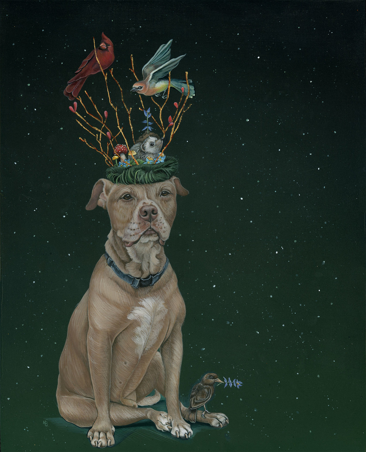 Nicole Bruckman is an artist, curator, mother, and animal advocate from Cleveland, Ohio. Embracing her passion for art at a very young age, Nicole went on to receive her BFA in illustration from the Columbus College of Art and Design in Columbus, Ohio. After graduation Nicole began work as a freelance illustrator and designer. Deciding to further pursue her love for painting, Nicole moved to Los Angeles, and began showing her art as well as curating shows at various prominent Los Angeles galleries. Compelled by her life’s passions, Nicole’s paintings are inspired by the bond that exists between humans and animals. She creates enchanting and whimsical narratives in which human and animal characters coexist in fantastic and engaging settings. Wild exotic creatures and domesticated animals alike are the guides on a sublimely surreal journey through an endless nocturne. They live in a seemingly utopian realm, in which humans are conscious of the bond between our world and the kingdom of Animalia. These works are created in the hopes that this world may one day exist, and we may recognize and respect the value in all living beings. All of the pieces are acrylic on wood panel.