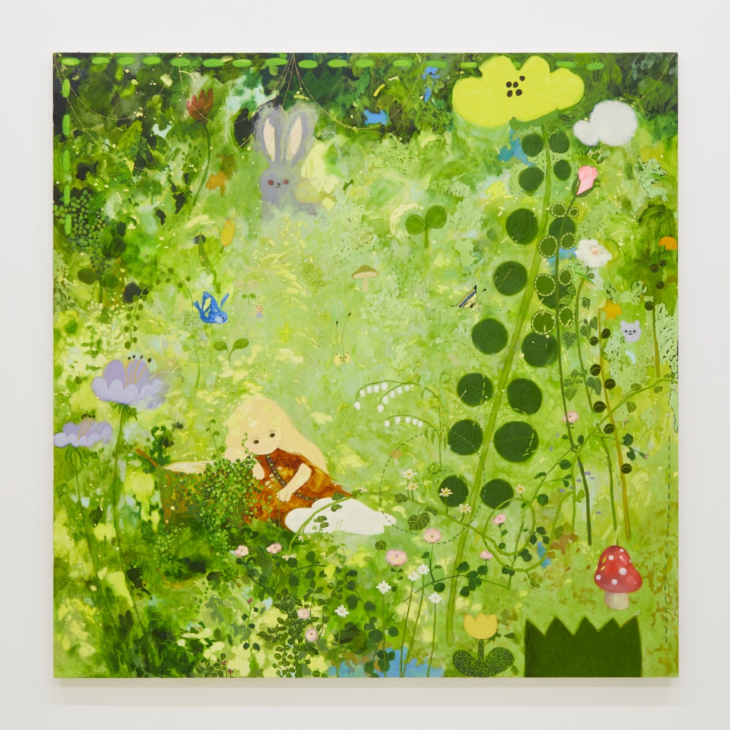 Tomoko Nagai’s works are known for their recurring girlish subjects and for the density of their compositions. Her palette is characteristically comprised of pastel hues that shift subtly depending on the mood or a particular season embodied by a work. Her tableaux occupy indeterminate spaces appearing to be composites of several places, at once indoor and outdoor, varying between fine detail and flatness unto abstraction. Recurring motifs in her work include endearing animals (particularly cats and bears), forest vegetation, toys, and young girls dressed as princesses. She sometimes presents her paintings and drawings in embellished frames arranged in suites, or as an installation. Nagai also creates sculptural objects featuring similar imagery; some of her other well known works include wall-mounted stuffed animals and human-scale dollhouse settings.